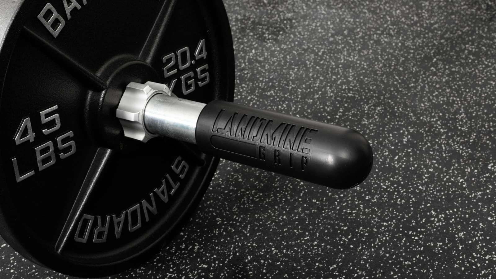 The patent-pending Landmine Grip from AbMat is designed to slide onto the end of any standard Olympic barbell, providing a firm, comfortable grip for landmine exercises and more.