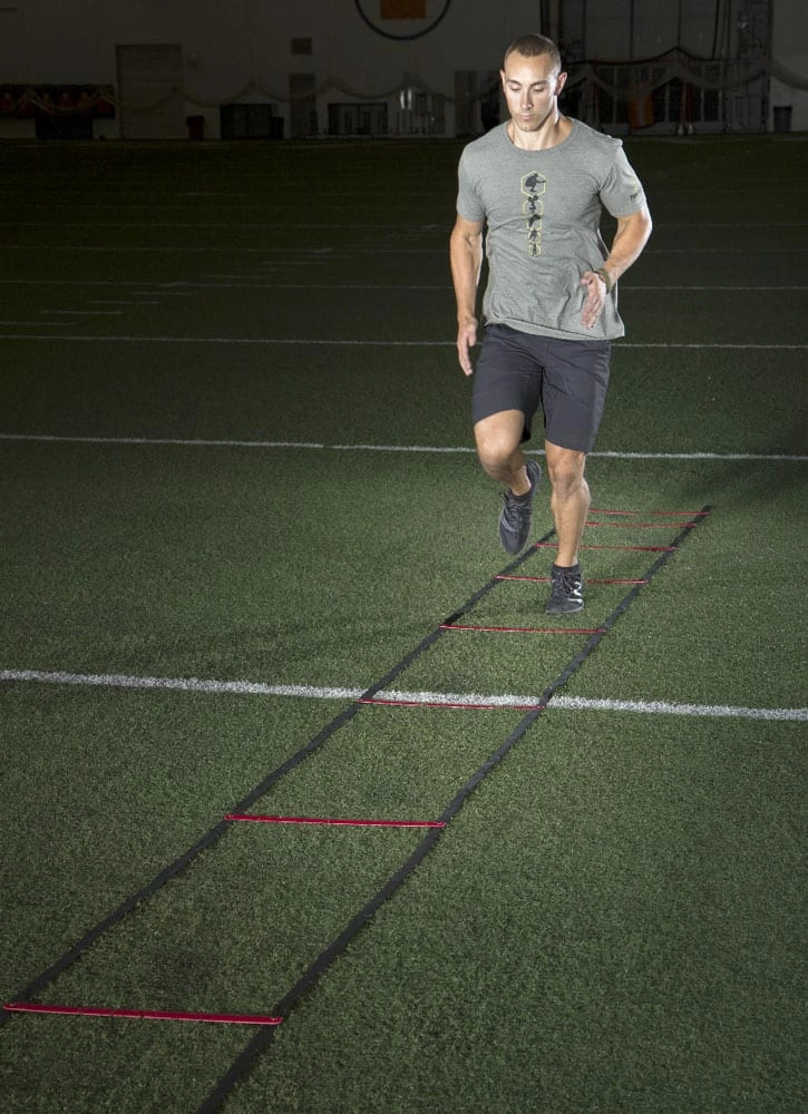 Designed to incrementally increase stride length and frequency, the two key elements to sprint speed. New design features all red rungs, black sides, and a carry bag. Increasing stride spacing from 12” to 69”.