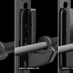 Monster 2” Sandwich J-Cups: 2” width, 10” height, ⅜” plate steel, 20 LB The side plates fit into a recessed, machined plastic core (2″ wide) to prevent metal-to-metal contact. The hardware (that connects the plastic to the side plates) is also recessed, preventing the bar or a user’s hand from scraping against them. Welds are insides the side plates for a clean edge, and UHMW plastic is featured on the clasp and back plate to prevent damage to the uprights. A thin piece of rubber on the side of the clasp also softens contact between the clasp and upright when the J-Cup is swung into place.
