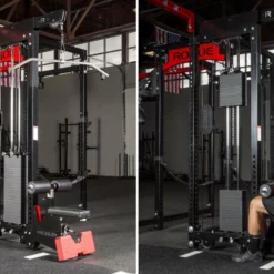 This is the rack-mounted version of Rogue’s Monster Lat Pulldown and Low Row machine (a stand-alone version is also available). Compatible with any existing 3×3″ Monster Series rack or rig, this 8′ tall add-on ships fully assembled, and includes a 300LB weight stack (10LB increments), stainless steel lat bar, diamond-tread adjustable footplate, 6″ nylon pulleys, and a set of custom-built black carabiners—one each for the lat pulldown and the low row.