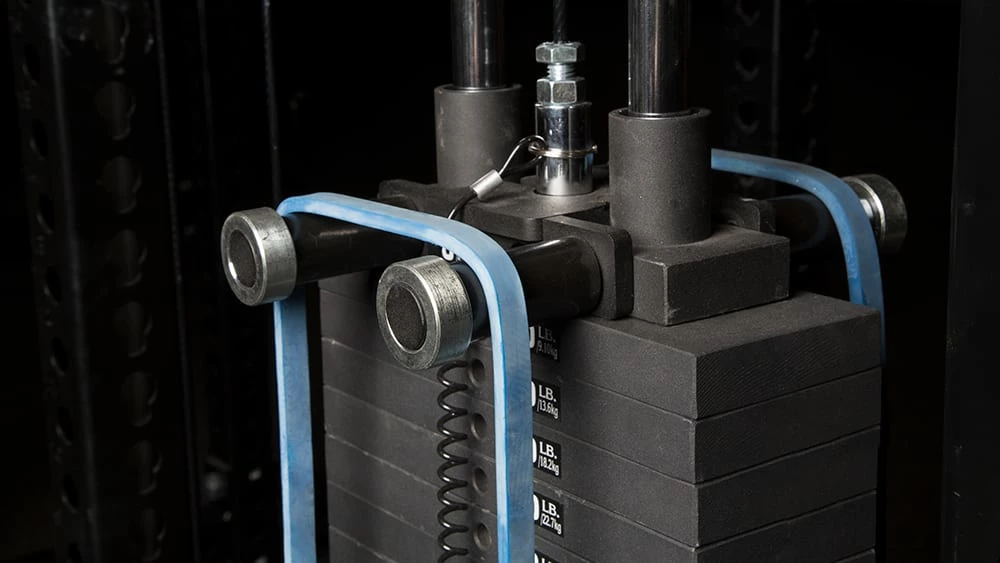 Our latest Monster Lat Pulldown introduces larger 6″ pulleys (vs. the original 3.5″), which help reduce friction and prolong the life of the cable. We’ve also upgraded the cable itself (USA Mil Spec) and added UHMW protective plastic to the tubes and pulley assemblies that the cable passes through. The eye (where the cable connects and carabiner clips on) is now machined in house from stainless steel, and all orders include a long term lubricant for the guide rods, allowing the weight plates to slide more smoothly.