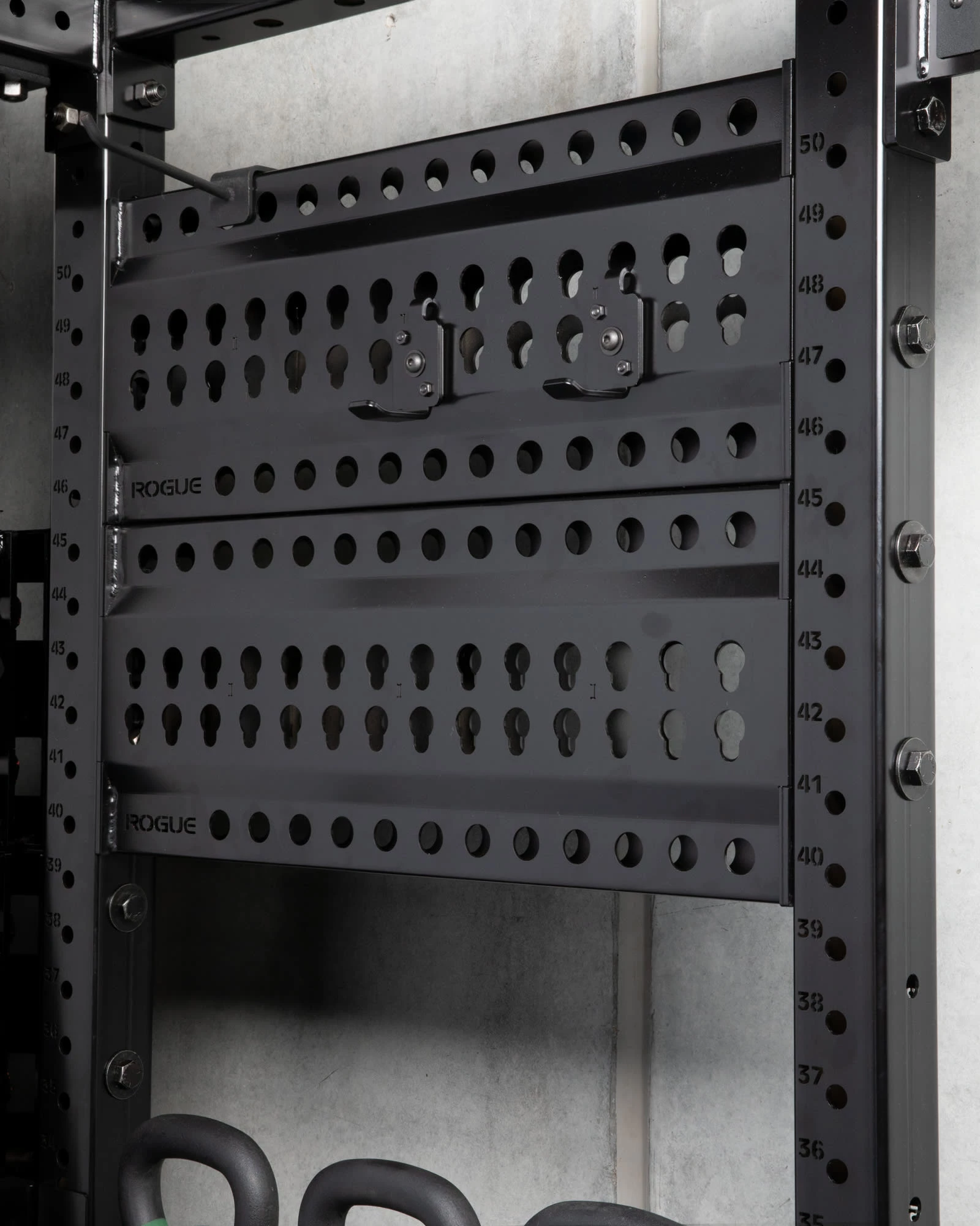 All of our Rack Storage Panels are manufactured in the USA from US steel, with laser-cut Rogue branding, a medium-gloss black powder coat finish, and convenient recesses in the back for tightening mounting hardware. PLEASE NOTE: While these panels mount to Monster LITE units, they’re designed for attaching Monster Series accessories. The top and bottom sections include standard 1” holes (spaced 2” on center horizontally), while the center section features a row of tear-drop 1” keyholes (spaced 2” on center horizontally and vertically). This enables the addition of Monster attachments not previously compatible with M-Lite units, including the Monster Plate Storage Pin and Monster Attachment Post.