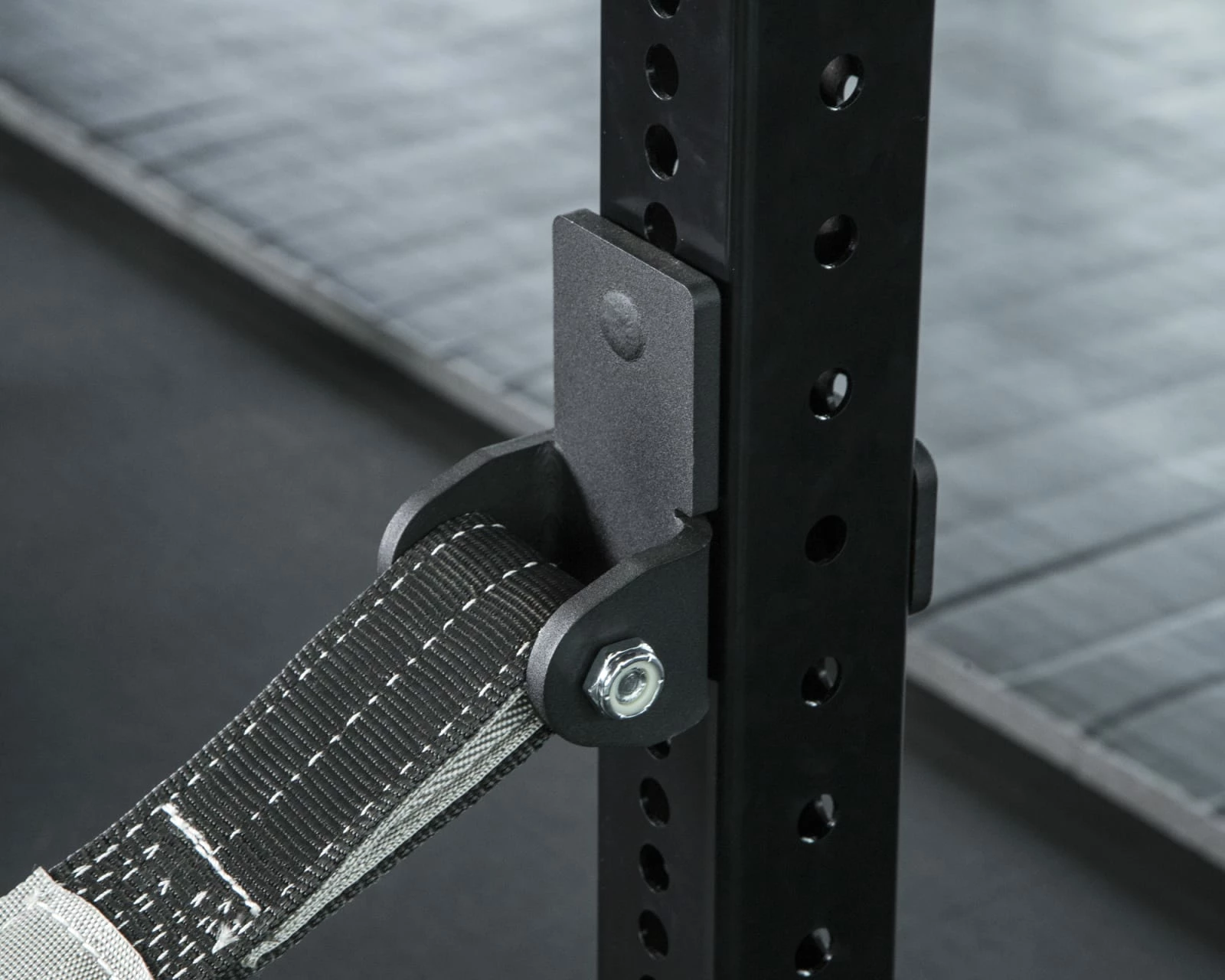 The Monster Lite Strap Safety System offers a simple but reliable solution for protecting both your equipment and your body during even the heaviest lifts. The set, which is compatible ONLY with Rogue Monster Lite rigs and racks, includes 0.3125″ thick-formed steel brackets and 0.625″ diameter pin, and a pair of 3″ Wide Reinforced Black Nylon Straps, rated for over 10,000LB. As an advantage over some pin/pipe and flip-down safety systems, you can mount the ends of each strap hanger at different heights. This gives athletes the option of positioning the strap so that the barbell will roll safely away from them on a drop.