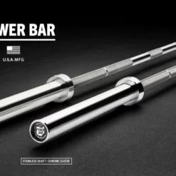 The Stainless 45LB Ohio Power Bar is manufactured in Columbus, OH, and includes a zero-flex 200,000 PSI tensile strength shaft, quality bronze bushings, and 16.25” of loadable sleeve length.