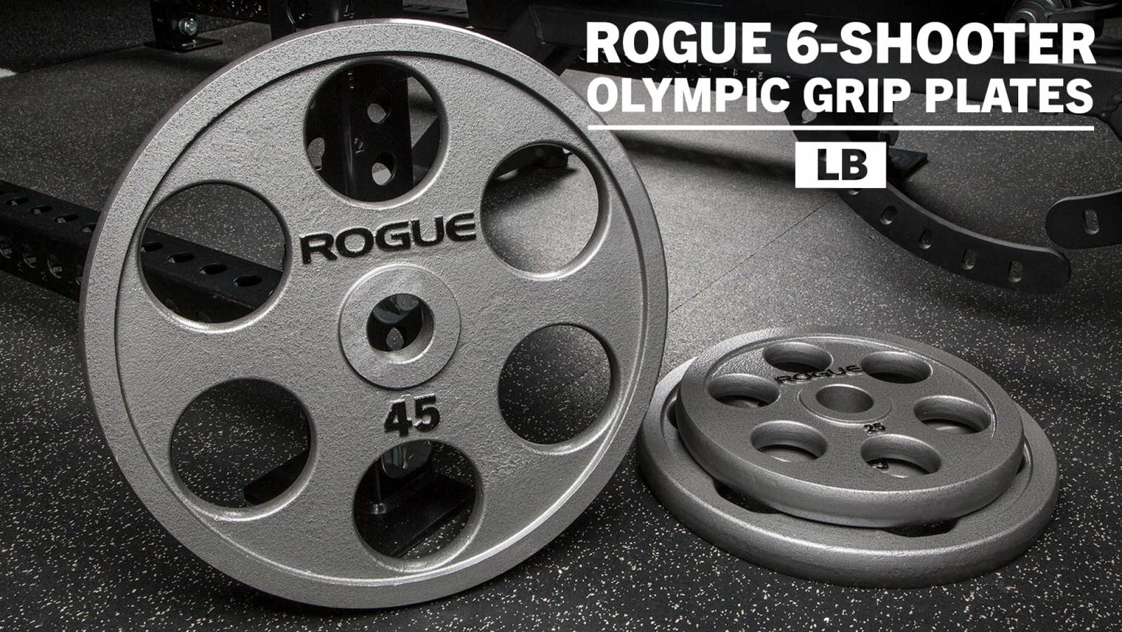 Each 6-Shooter Olympic Grip Plate includes LB markings, exclusive Rogue branding, and a 2” diameter collar opening for compatibility on any standard Oly barbell. The smaller 6-Shooter change plates (2.5LB, 5LB, and 10LB) include a center hole only, without the additional six-hole pattern.