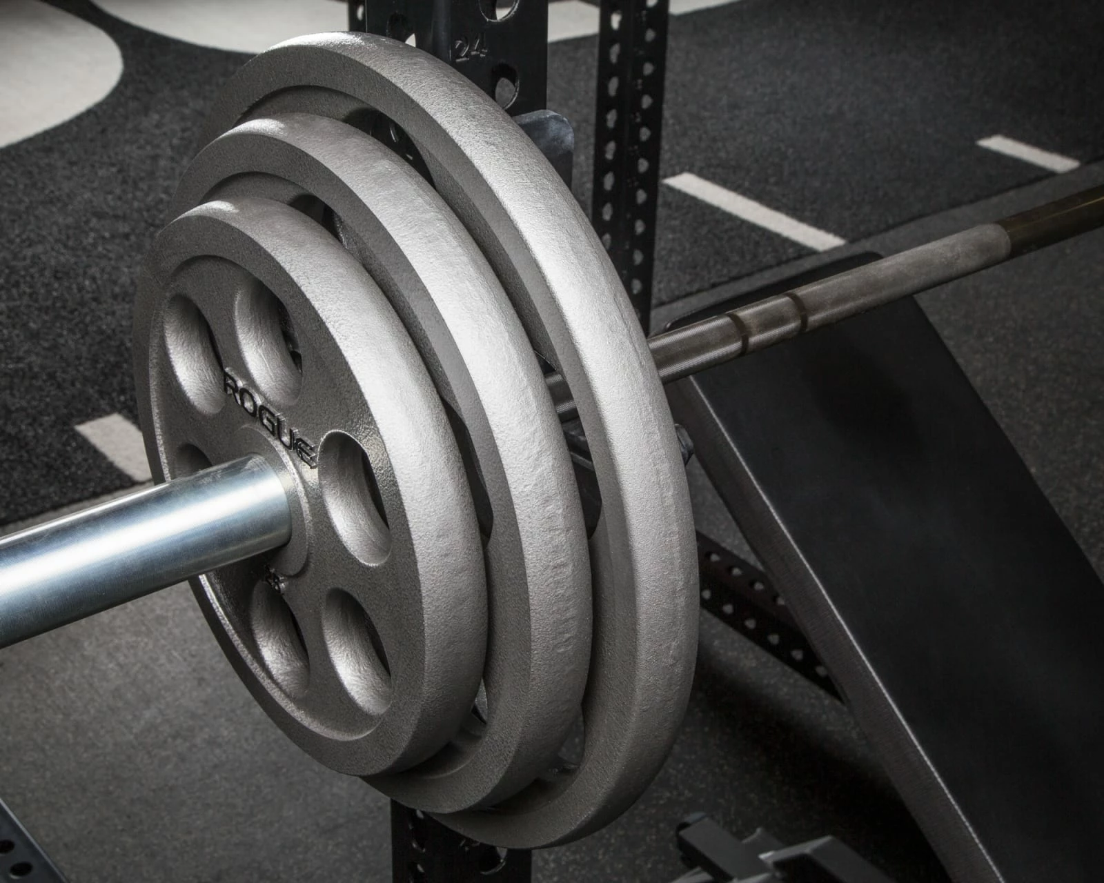 Our Rogue 6-Shooter Grip Plates feature a unique gray hammertone finish, black text, and six symmetrical grip holes spaced out around the circumference of each 25LB, 35LB, and 45LB plate (a Urethane Coated 6-Shooter is also available). The holes are precision-cut and in close proximity to the raised lip at the edge of each plate, offering athletes a comfortable grip and an easier way to lift, carry, or load a plate from any angle.