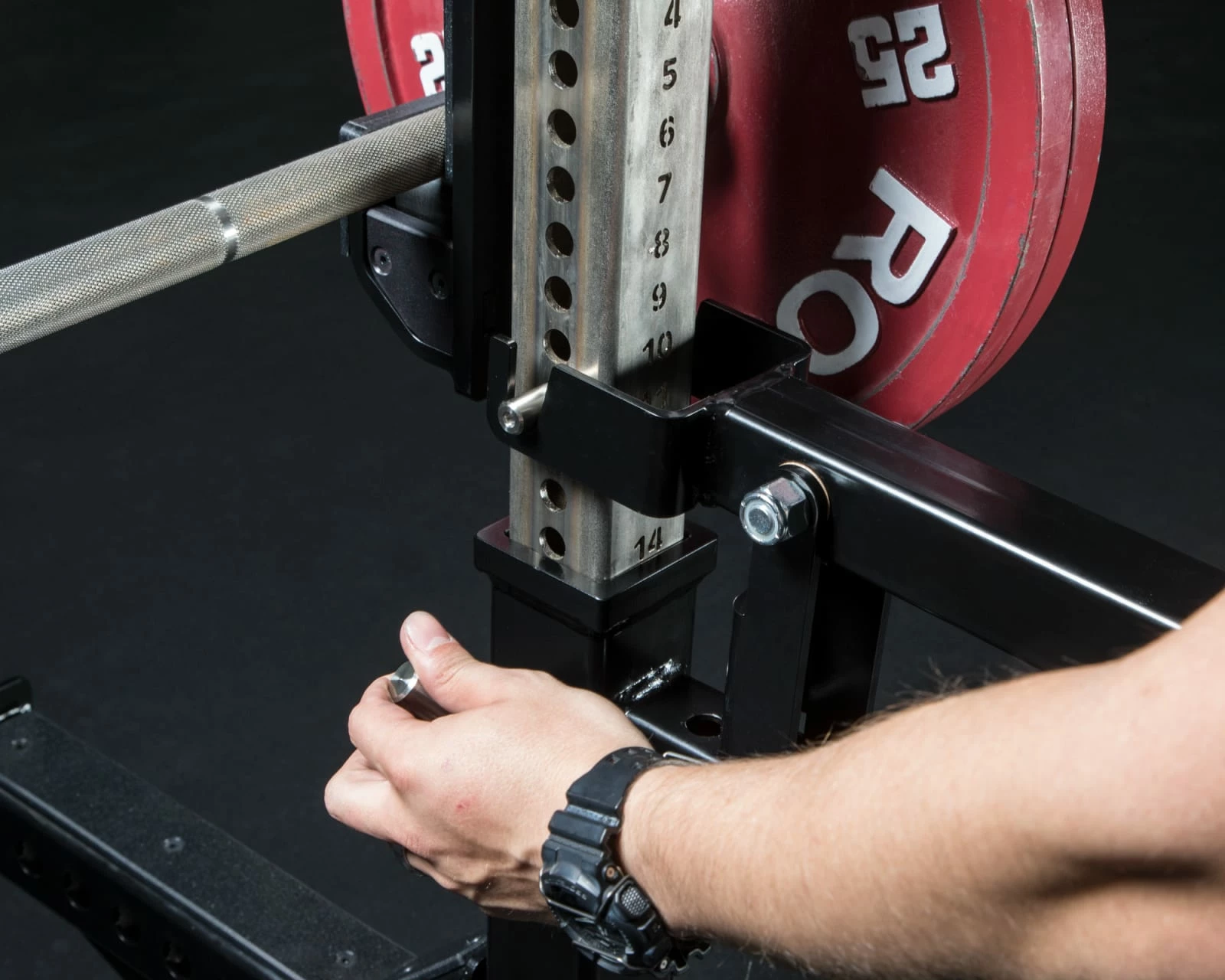 When you want to switch between athletes of different sizes, the height of the J-cups can be quickly adjusted using our unique jack system—with no need to waste time removing plates from your barbell. Simply use the lever arms to raise or lower the position, referring to the laser-cut numbers in the uprights for guidance. Both the jack handles and the telescoping tubes of the uprights are made from stainless steel, as are the (4) machined pins used to set the upright height. Storage for these pins is integrated into the jacks themselves.