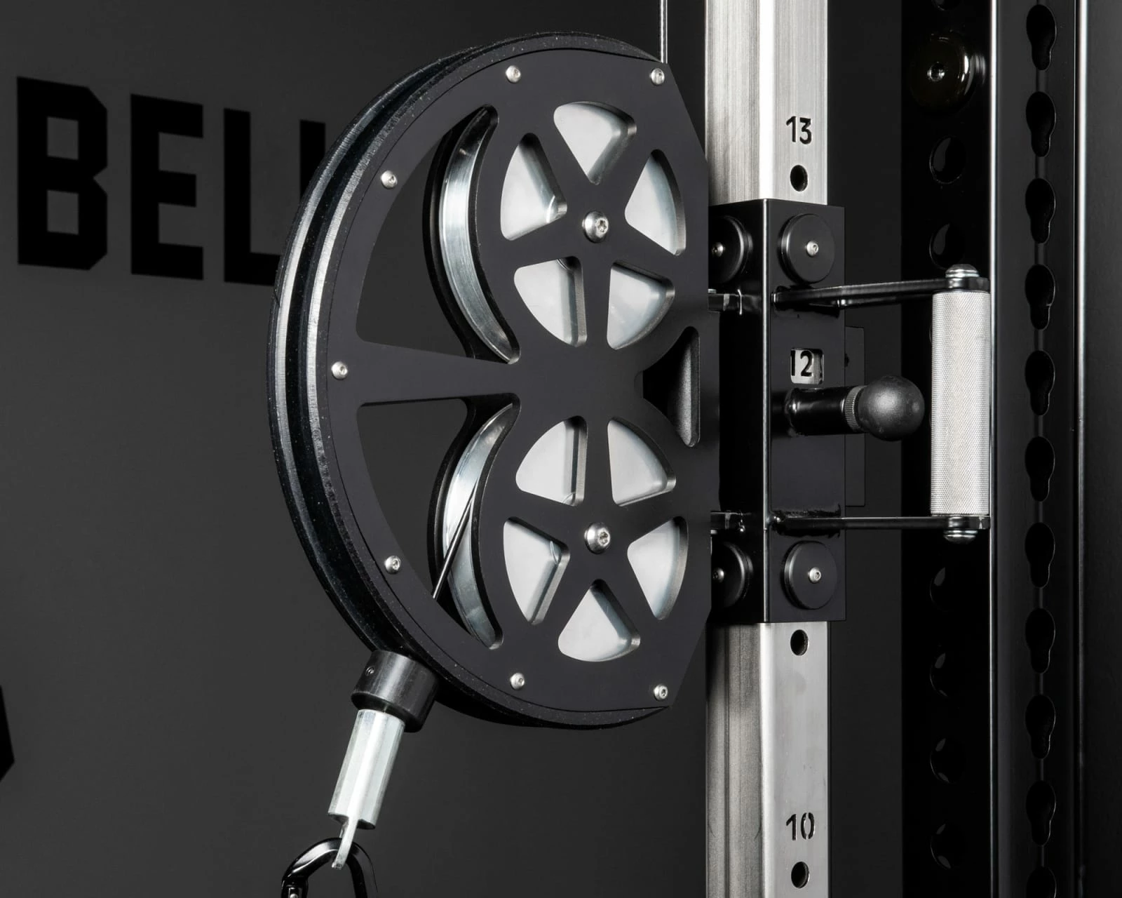 The single handle pulley assembly features a 180-degree swivel and can be quickly set up high or low depending on the workout, utilizing the knurled stainless steel adjustment handle. There are 16 different height adjustment settings on the 2×2 rail, and with acetal pads inside the handle assembly, users can easily move the swivel up and down without damaging the stainless slide tube.