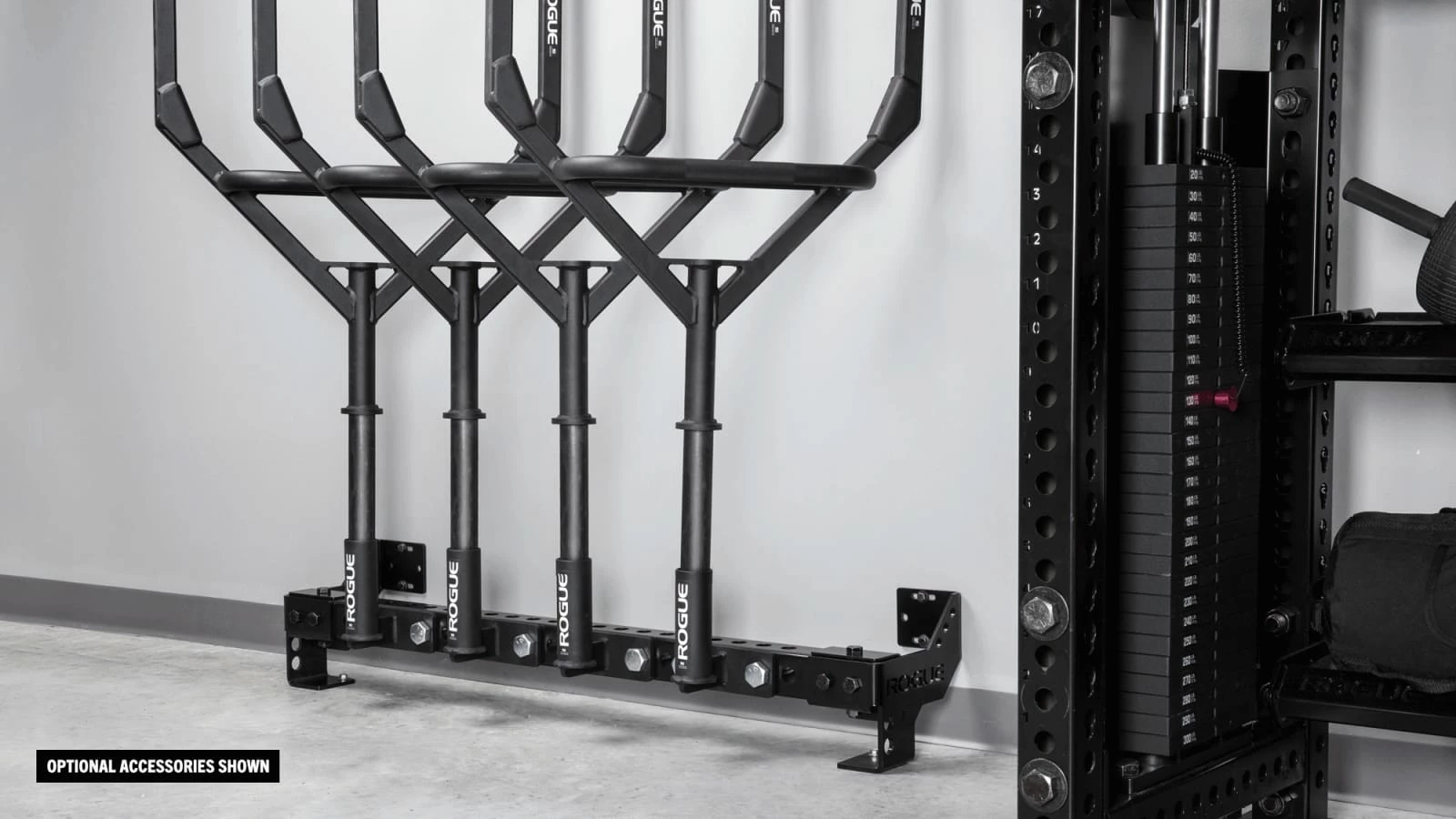Rogue initially developed this patent-pending accessory for use in the training facility of the NHLās Columbus Blue Jackets, and itās now been refined for almost any type of gym layout, with mounting points spaced at 48ā to fit on standard 16ā-on-center wall studs. The space efficient Heavy Rail extends just 11ā from the wall (11.75ā with optional stringers) and measures 7-ā ā in height (from the floor to the top of the steel tube).Ā
