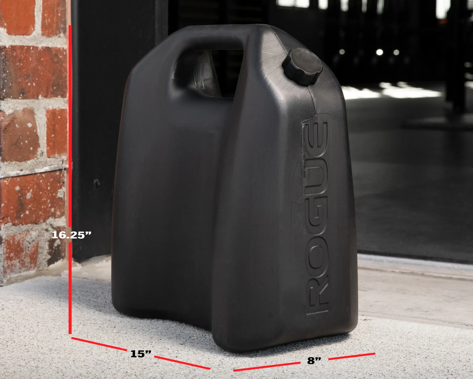 Rogue’s JC-40 Jerry Cans are large, durable, handle-top containers that athletes can fill with water to perform Farmers Walks, Overhead Presses, Squats, and other movements at a customized weight load. These were inspired by the original metal Jerry Cans used in competition at the CrossFit Games back in 2011; but are produced here in a lighter, more economical HDPE (high-density polyethylene) design.