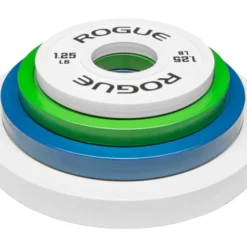 Rogue LB Change Plates are sold in pairs or full sets, and include 1.25LB, 2.5LB, 5LB, and 10LB weight increments. Each plate features a 50.40MM collar opening and an exterior rubber coating for a firm, steady hold on any standard Olympic barbell. A color coding (Green/Blue/White) and quality matte finish give the plates a bold look, with easy recognition from a distance.