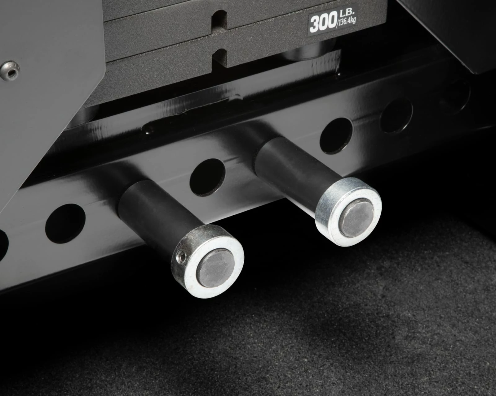 There are a number of new features we’ve introduced with Version 2.0. The durable aluminum pulleys are an upgrade over the previous nylon version, and both the pulleys and weight stack are now machined in-house at our Reflex plant. Weight stack shrouds are also included standard—adding safety and potential space for custom branding—and new stowable flip-down foot pegs make it easy to get in and out of the machine when using it for lat pulldowns. Finally, an updated swing-arm style hip pad makes for smoother and easier custom adjustments. Overall, the LP-2 Lat Pulldown / Low Row is both a functional and stylistic upgrade, more closely conforming to our current Monster Rack and Slinger designs.