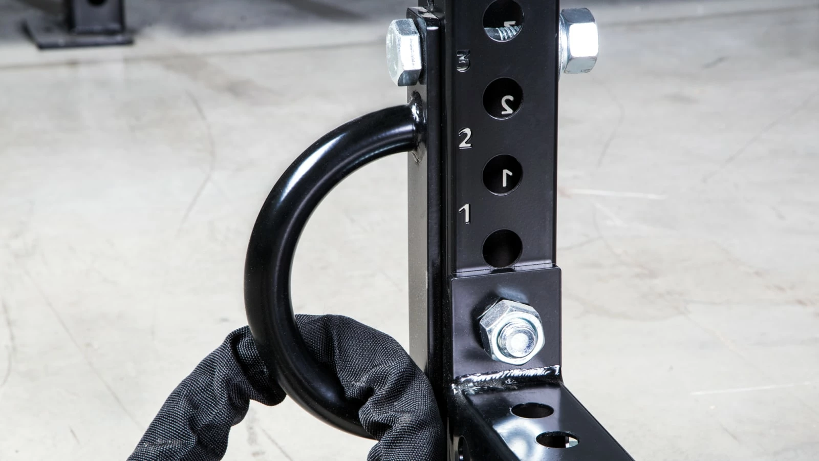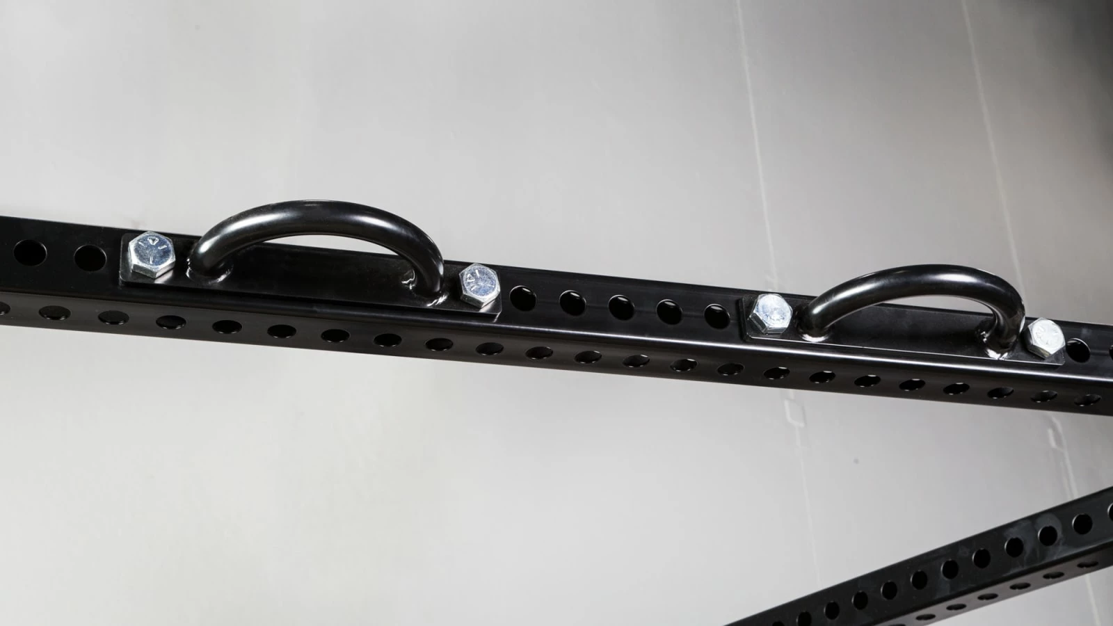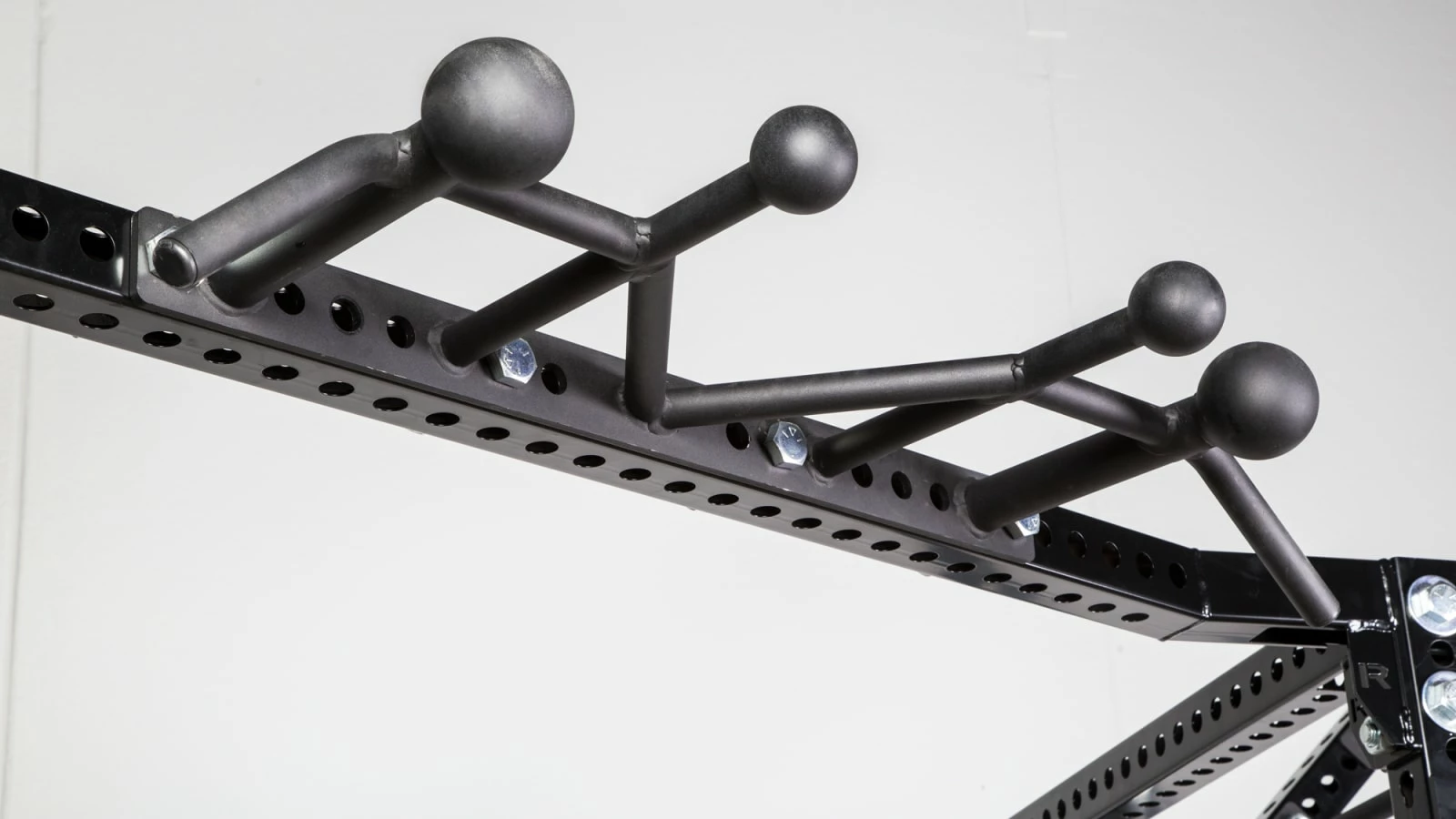 The base structure of the Wingspan Rig consists of (10) Monster 100” uprights, each Made in the USA from 3×3″ 11 Gauge Steel with Numbered Uprights numbering and a Medium Gloss Black powdercoat finish. In the front of the unit, four of the uprights form the RM-4 rack, equipped with a 43” Single Pull-Up Bar, standard J-cups, Monster 43” Strap Safeties, band pegs, and a two-tone Rogue nameplate in MG Rogue Red and Black.