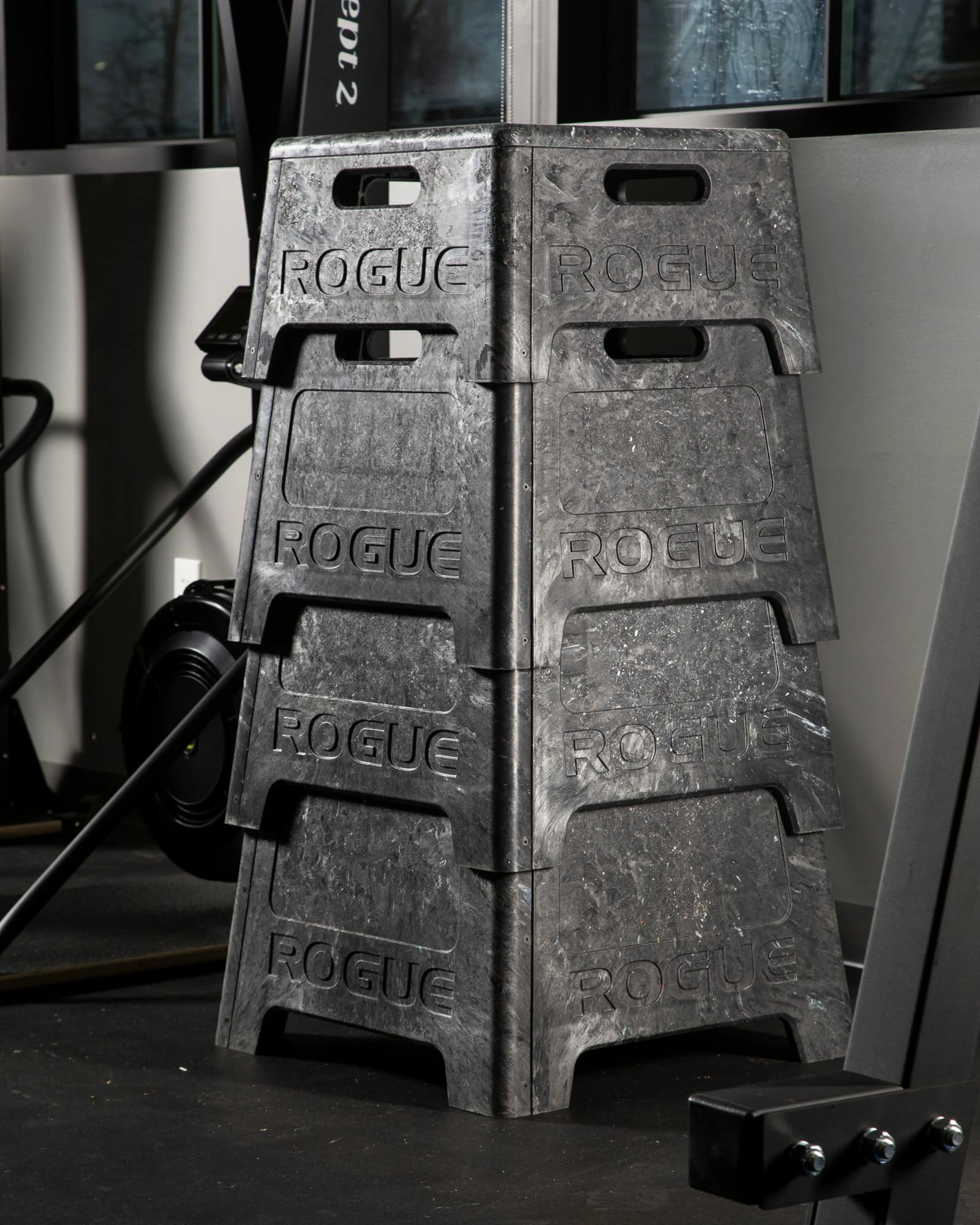 Rogue Resin Plyo Boxes can be ordered individually or as a full set featuring (1) each of all 4 sizes. They are packed flat, saving the customer on shipping costs, and require only minimal assembly (holes are pre-drilled). Once built, multiple boxes of any size can be stored conveniently in overlapping stacks–a space-saver for small home gyms and larger facilities, alike. Hand-hold slots are also included on all four sides of the box for easy transport, placement, and removal.