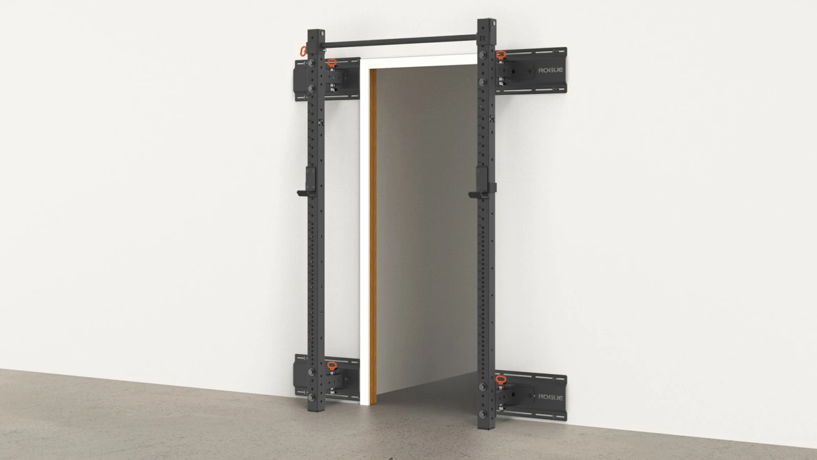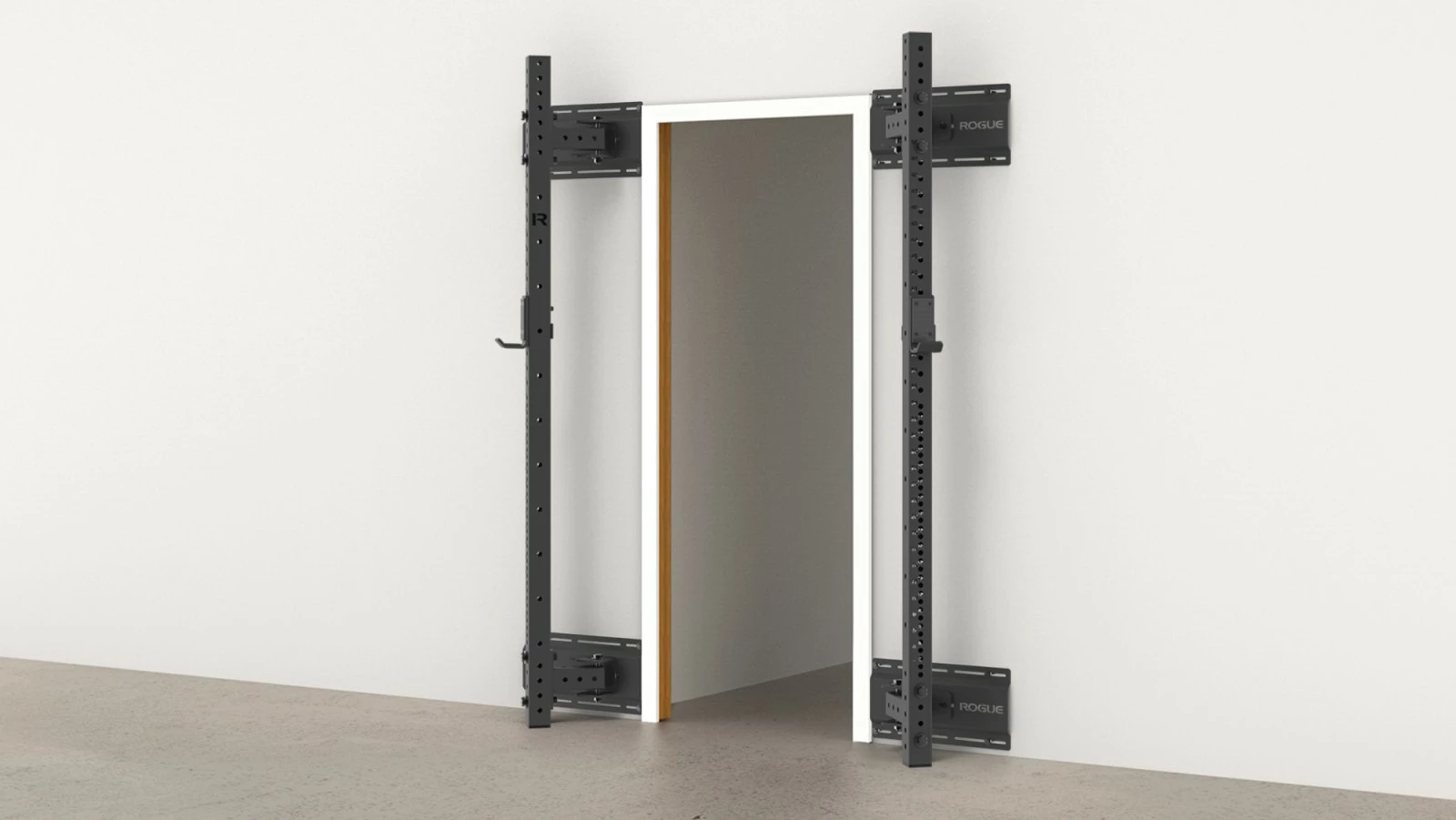 The Rogue Door Mount Rack is manufactured in the USA and features two 3×3” 11-gauge steel uprights (with laser-cut numbering and protective UHMW feet), a Monster Lite Adjustable Pull-up Bar, and a set of standard Monster Lite J-Cups. Our convenient hinge-and-pin system ensures that the uprights are secured in place when the pin is fastened, and that they can easily fold back (away from the door frame) when not in use. When folded, the unit extends just 5” off the mounting surface, opening up substantial room in a training space.