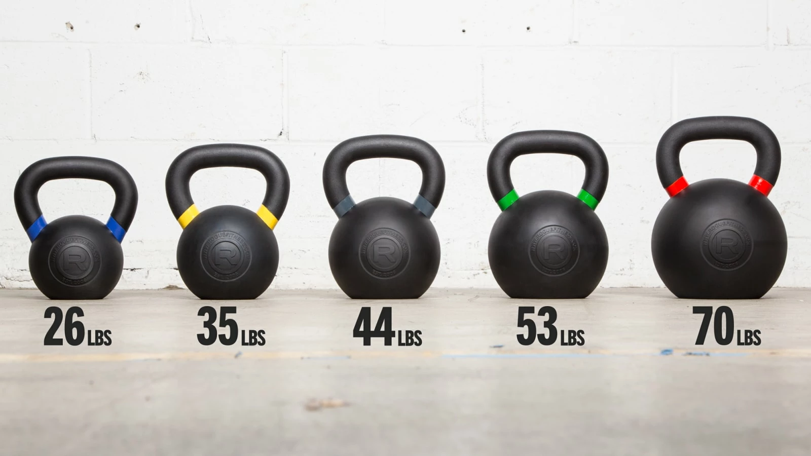 Rogue Rubber Coated Kettlebells are available in five weight increments (26LB, 35LB, 44LB, 53LB, 70LB) and feature a single-piece casting, wide flat machined base, and color-coded handles with a textured, powdercoat finish. The black urethane exterior coating includes exclusive Rogue branding with the “R” logo.