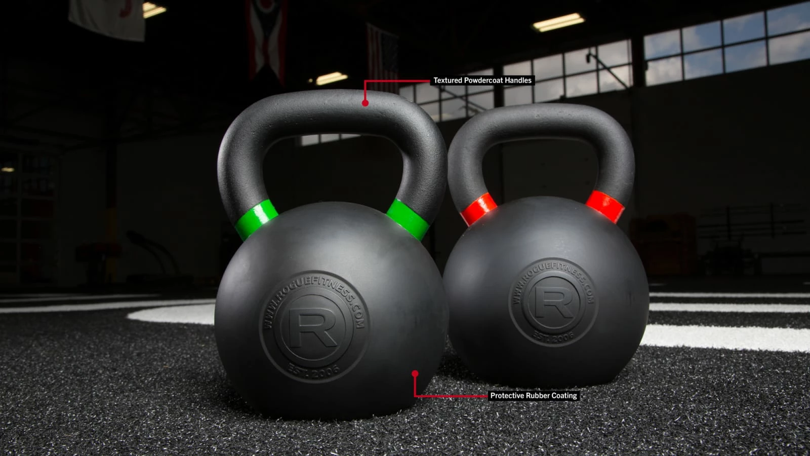 Manufactured from the same first-run iron ore as our standard Rogue Kettlebells, these durable new KBs feature a protective rubber coating around the entirety of the bell, helping to prevent the scuffs and chips that often come with daily kettlebell use in high-traffic training spaces.