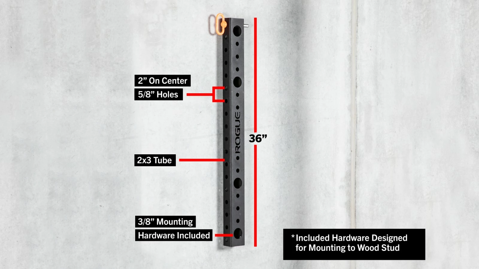 Each order comes with (1) 5/8″ x 4″ detent pin and a set of (4) 3/8″ x 2-1/2″ wood lags for mounting to a stud.* The front of the Strip includes (4) oversized holes to allow for easy tightening of the lags. Holes are spaced 2″-on-center along each side of the Strip.