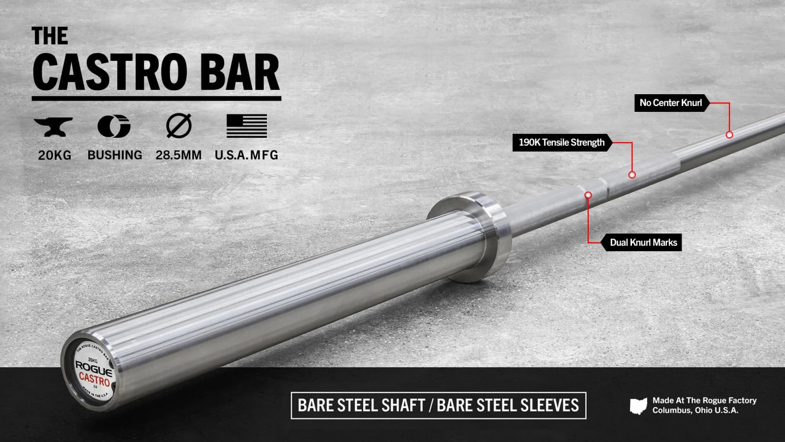 For athletes who prefer the classic look and feel of a bare steel barbell, the Rogue Castro Bar belongs in your arsenal. This polished 28.5MM bar is machined and individually assembled in Columbus, OH, and features the same quality U.S. steel, bronze bushings, and dual knurl marks as our flagship Ohio Bar. The texture of the signature knurling allows for a firm grip without feeling sharp, and the bare steel won’t get slippery in sweaty hands–making the Castro Bar less dependent on chalk than many coated bars.
